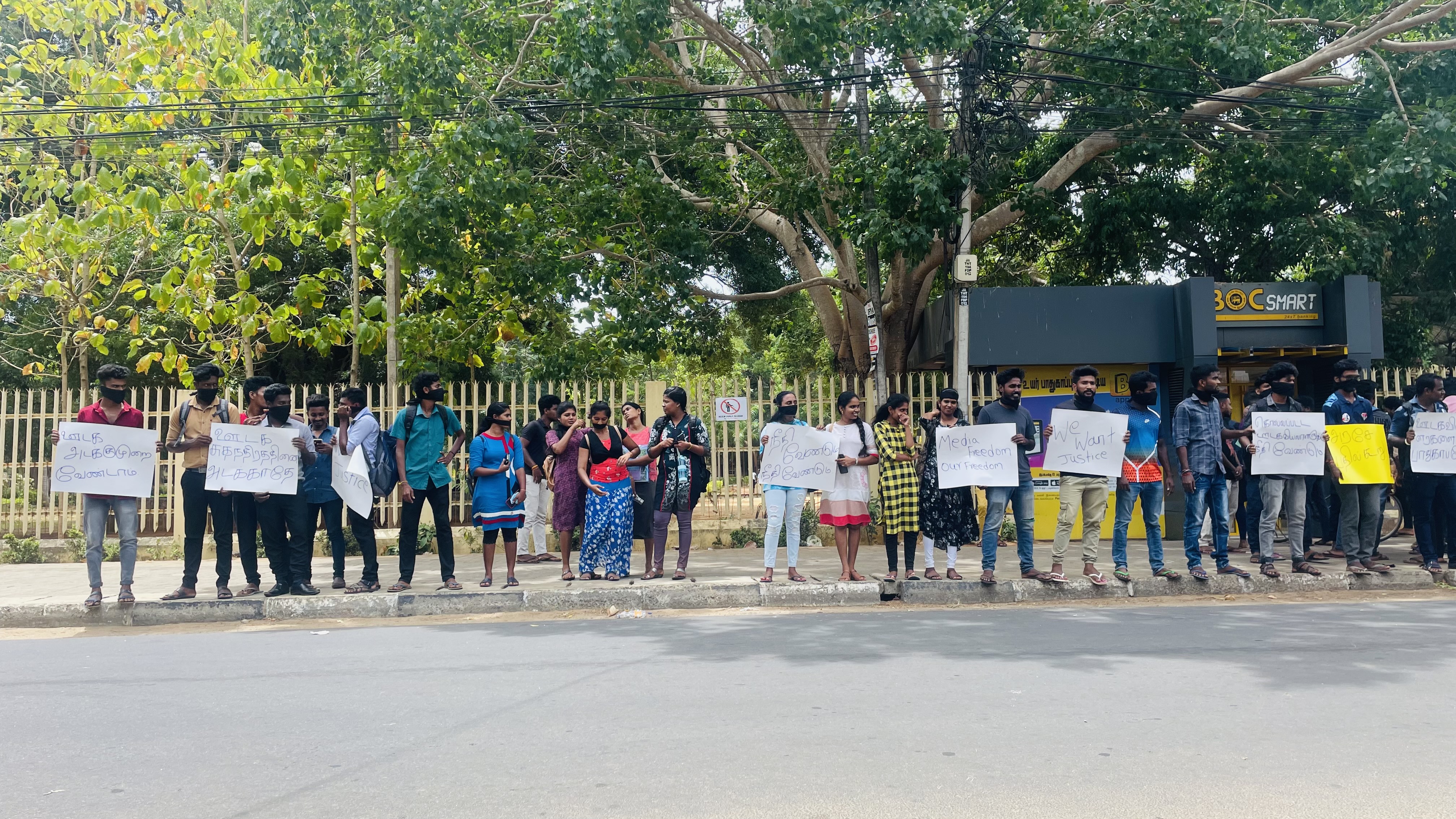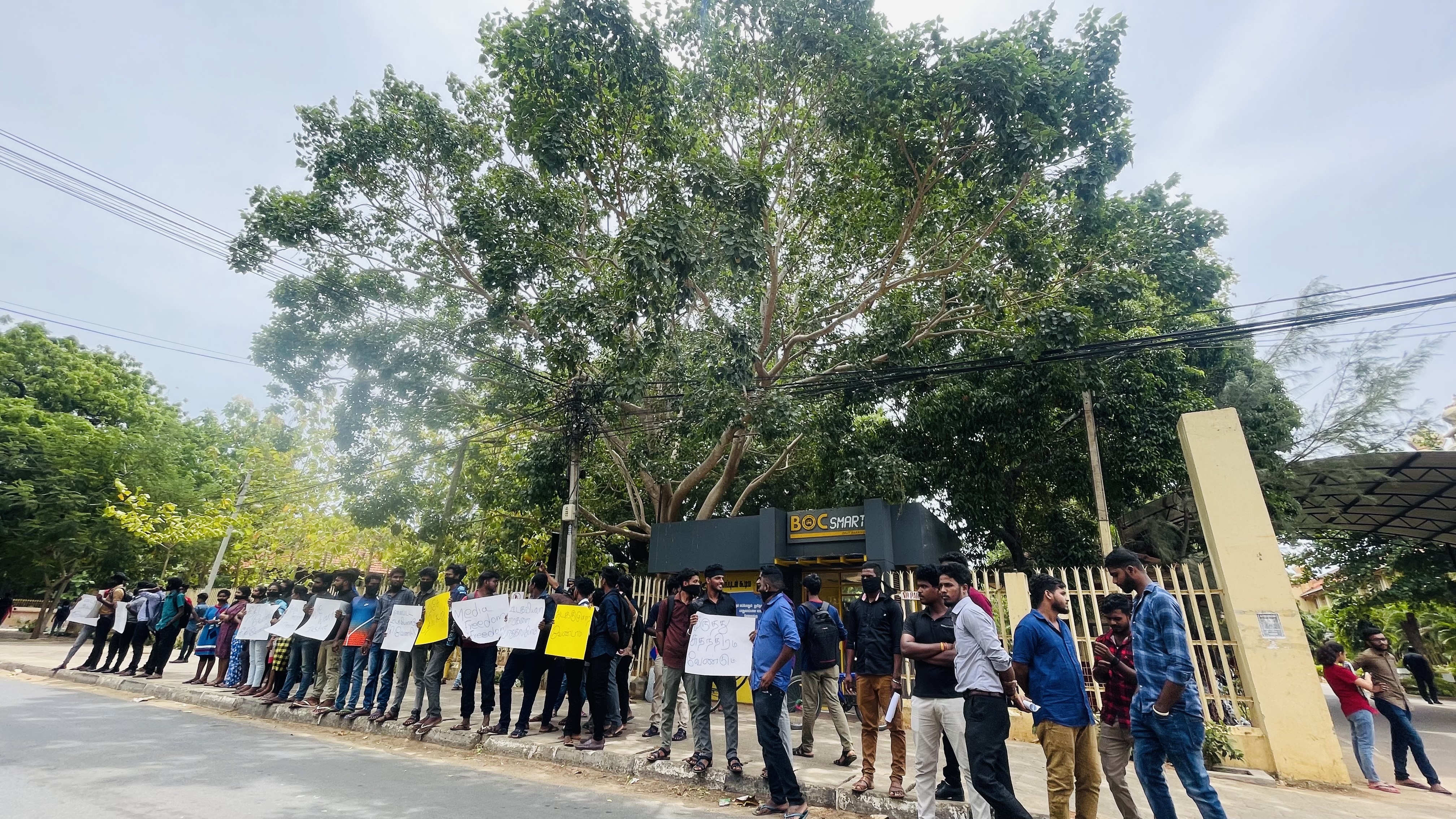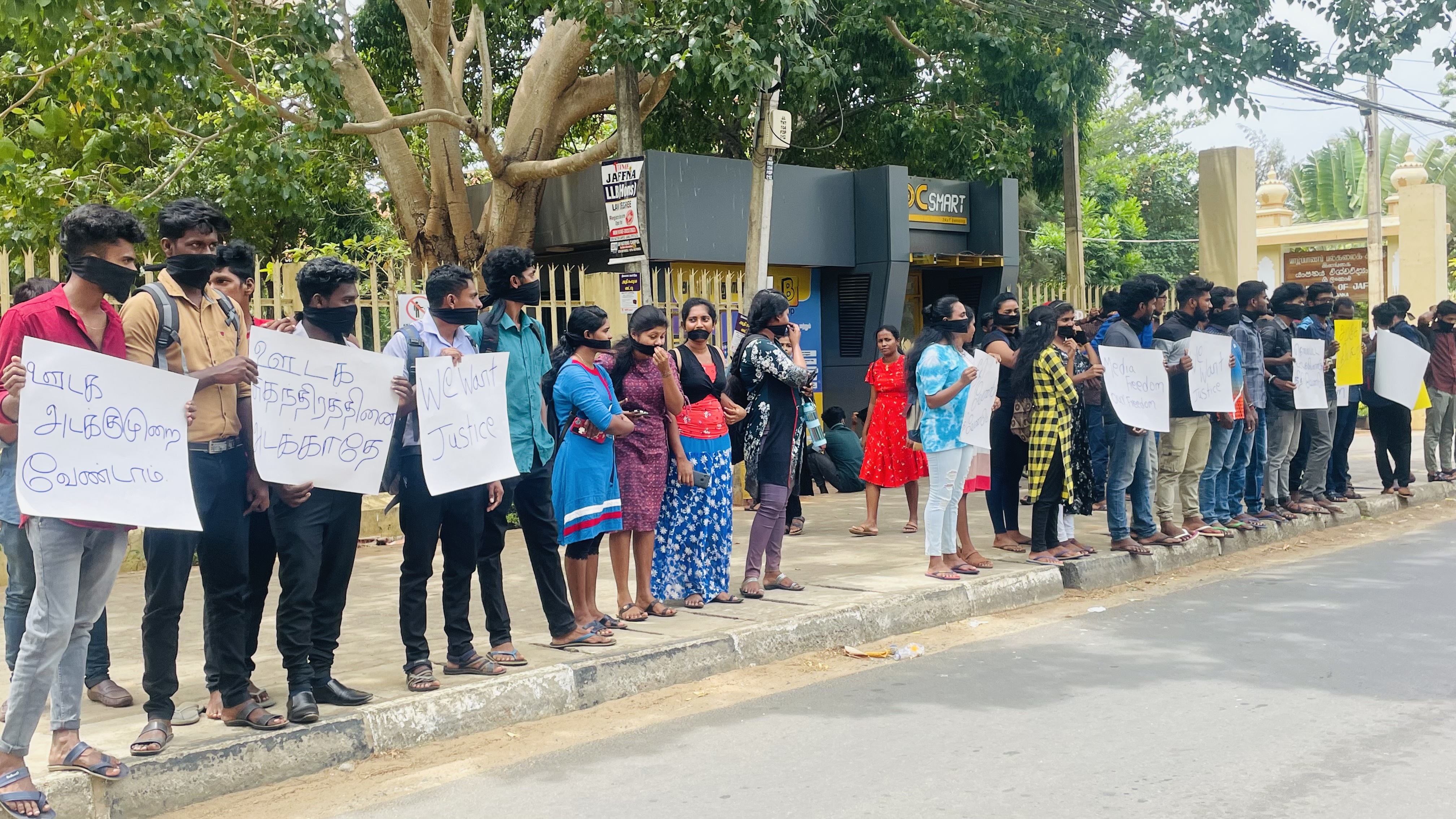 ஊடக அடக்கு முறை , ஊடகவியலாளர்கள் மீதான தாக்குதலை கண்டித்து யாழ்.பல்கலைக்கழக முன்றலில் கண்டன போராட்டம் முன்னெடுக்கப்பட்டது.